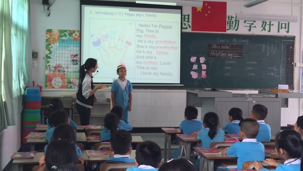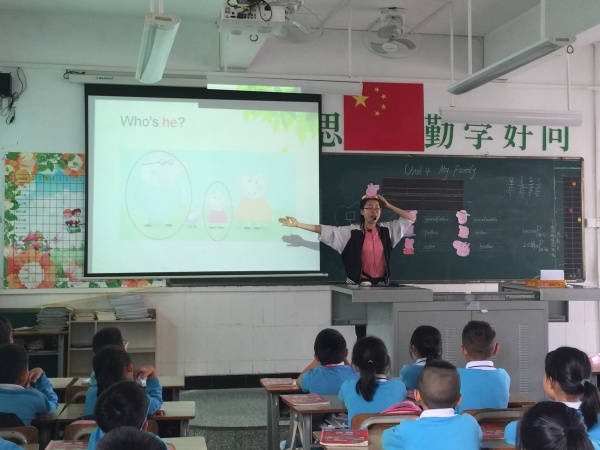 在第二節(jié)課,來自載德小學(xué)毛志敏老師展示一節(jié)三年級上冊My Family的詞匯課。毛老師本節(jié)課注重營造和諧融洽的課堂氛圍、教態(tài)自然,語調(diào)親切,并能不斷鼓勵學(xué)生,給三年級剛學(xué)英語的學(xué)生足夠勇氣去嘗試用英語來表達(dá)。毛老師通過唱歌方式調(diào)動學(xué)生學(xué)習(xí)氛圍,設(shè)置小豬佩奇介紹家人的情景引入本課的詞匯和句型,最后通過游戲和介紹自己家人的任務(wù)來鞏固所學(xué)的目標(biāo)語言。整個教學(xué)環(huán)節(jié)環(huán)環(huán)相扣,思路清晰,課堂氣氛輕松活潑。