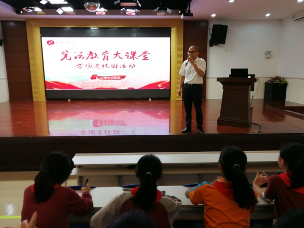 “法安天下,德潤人心”,為深入貫徹學(xué)習(xí)黨的十九大精神,增強(qiáng)學(xué)生的憲法意識,牢固樹立憲法信仰,2019年5月31日下午,新圩小學(xué)開展了 “憲法在我心中”大課堂教育活動,六年級全體師生參加了本次學(xué)習(xí)活動。主講人是香山律師事務(wù)所的熊震世律師。