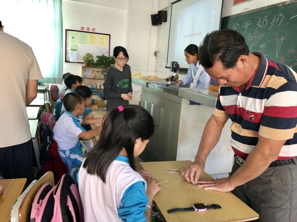 上課伊始,先讓學(xué)生了解一些竹制品,如我們常見的席子、簸箕、竹簍等等,進(jìn)而道出這些竹制品都是用竹篾來編織而成的。學(xué)生嘆為觀止,其中最吸引學(xué)生眼球的是黃鱔籠。恰巧授課的爺爺之前是一名船長(zhǎng),便給學(xué)生介紹了黃鱔籠編織的獨(dú)到之處,前細(xì)后粗,前端還藏有尖刺,黃鱔能進(jìn)不能出……學(xué)生聽得饒有趣味之時(shí)爺爺便給孩子們分發(fā)編織材料,現(xiàn)場(chǎng)手把手教孩子最基本的編織。學(xué)生們眼睛緊盯著爺爺?shù)氖痉?,自己也跟著編起來,學(xué)生邊學(xué)邊摸索,爺爺和義工老師們一對(duì)一輔導(dǎo),最后學(xué)生們都編織出了自己喜歡的成品。