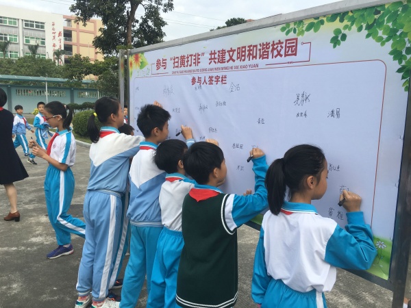 在鏗將有力鄭重的承諾后,由陳苕校長(zhǎng)帶領(lǐng)學(xué)校的行政團(tuán)隊(duì)進(jìn)行簽名,各班派五名代表上臺(tái)開(kāi)展承諾簽名活動(dòng)。在活動(dòng)結(jié)束后,讓高年級(jí)的學(xué)生在班主任的帶領(lǐng)下全員參與簽名承諾。