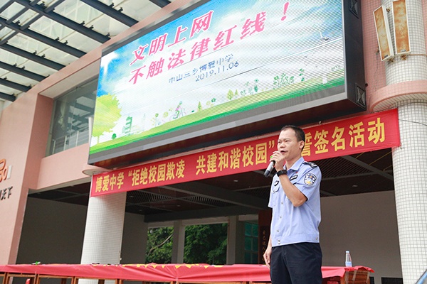 2019年11月11日,中山市博愛初級(jí)中學(xué)舉辦了以“拒絕校園欺凌,共建和諧校園”為主題的全體師生簽名活動(dòng)。此活動(dòng)意在加強(qiáng)學(xué)生的法制意識(shí),防止校園欺凌事件的發(fā)生,營(yíng)造平安、和諧的校園氛圍。