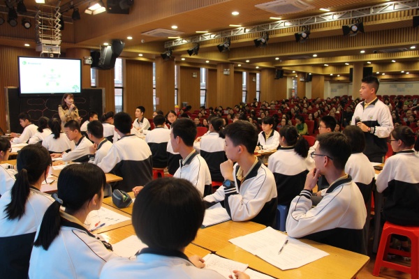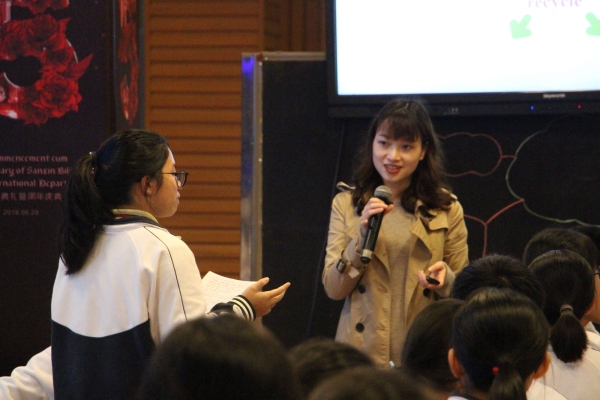 下午初中的培訓(xùn)活動(dòng)是由三鑫副校長(zhǎng)、初中部校長(zhǎng)、省特級(jí)教師宋春燕主持,三鑫初中部英語(yǔ)科組王喜愛老師執(zhí)教九年級(jí)閱讀課《We’re trying to save the earth》,配合展示的是三鑫九年級(jí)11班的同學(xué)們。王老師用一口令人稱羨的流利口語(yǔ)與同學(xué)們共同探討了“如何拯救我們的地球”這一閱讀話題。課堂上,同學(xué)們還用英語(yǔ)展示了自己對(duì)于廢物再利用的想法,內(nèi)容充實(shí),互動(dòng)性強(qiáng)。