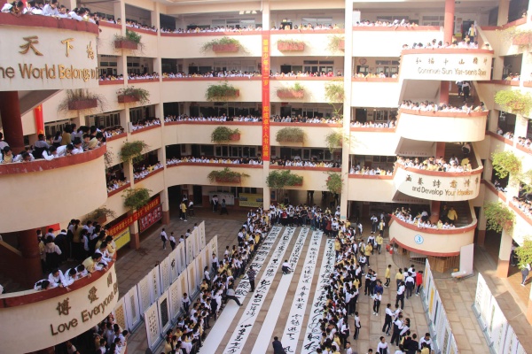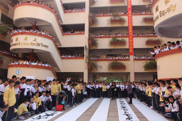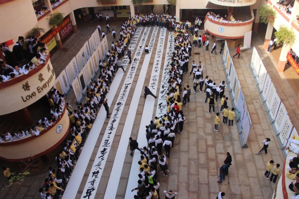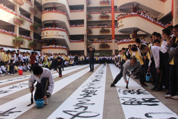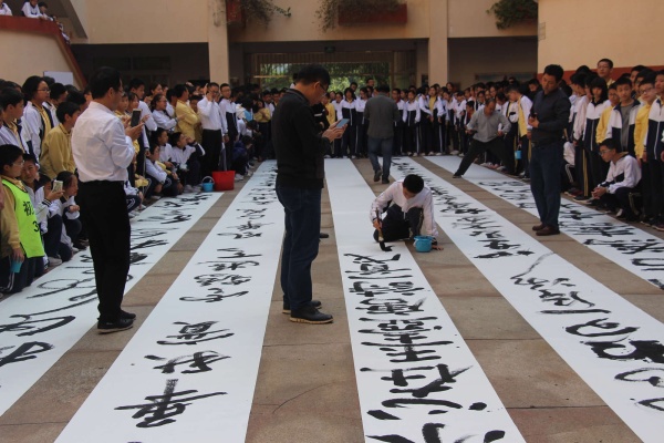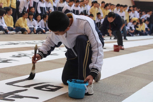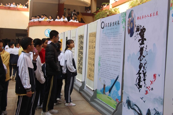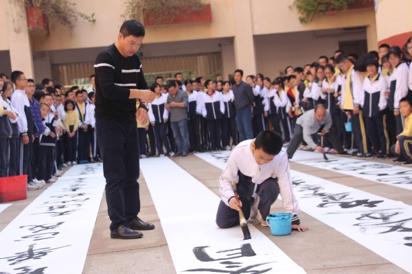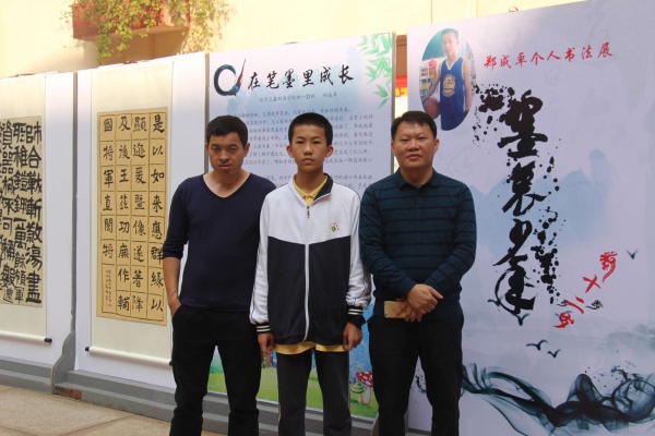 他今年12歲,學(xué)書6年,此次展出毛筆、硬筆作品近百幅,兼具篆書、隸書、楷書、草書、行書眾體等。展出現(xiàn)場,中國書法家協(xié)會會員、三鑫書法中心主任單永輝與三鑫蔣疑明、朱曉杰等書法教師鼎力相助,與鄭成卓一起,師生現(xiàn)場揮毫潑墨。初中部教學(xué)樓五個樓層,三千多師生圍觀,場面震撼,掌聲、呼喊聲不斷!