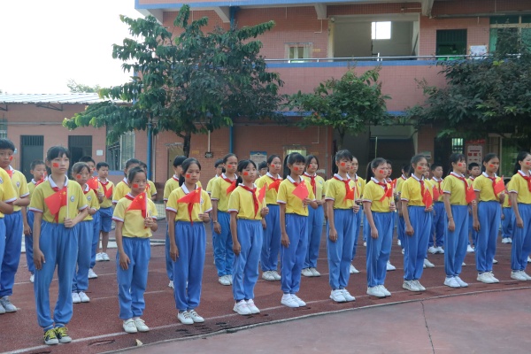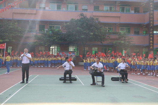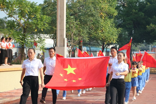 今天,擔任升旗手的是鄧勝輝、楊磊、葉明捷、周江萍四位老師,護旗手是王家樂等少先隊干部。他們邁著整齊的步伐,意氣風發(fā)地走向升旗臺。