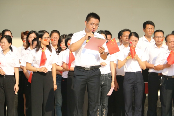 升旗儀式正式開始,東華學校德育處熊鈞俊主任主持熊鈞俊主任,他首先深情地回顧了1949年10月1日,在天安門城樓上,第一面五星紅旗在萬眾矚目中升起,毛澤東主席向全世界宣告了中華人民共和國的成立。今天,全校師生再次集會,舉行莊嚴的升旗儀式,以此來表達東華學校全體師生,對偉大祖國的無比崇敬和熱愛之情。在熊鈞俊主任深情的話語中,“禮贊新中國,奮進新時代”升旗儀式拉開了帷幕。