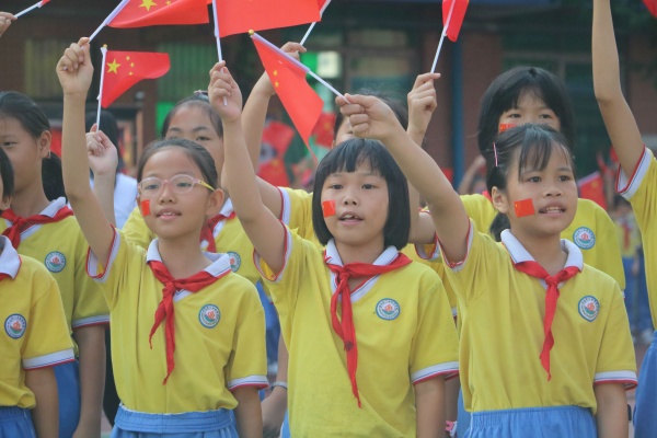 上午七點四十分,學校四、五年級學生開始進入操場,在籃球場中央組成“中華人民共和國地圖”圖案,并且在“中國地圖”中央,組成“70”圖案,寓意慶祝中華人民共和國成立70周年。學校合唱團隊員在大榕樹下的木質“成長舞臺”前,擺出“心形”圖案,寓意“我愛祖國”。其他班級陸續(xù)進場,八點十分,操場上已經成了人的海洋,紅旗翻動,像海上的波浪。
