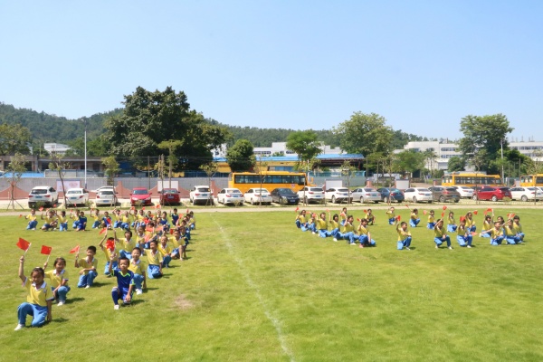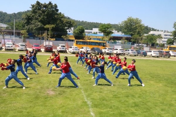 開幕式上,各代表隊(duì)隊(duì)列整齊、精神抖擻。首先,校舞蹈隊(duì)的同學(xué)們化身足球?qū)氊?,在陽光綠草間熱力起舞,贏得運(yùn)動(dòng)員們的陣陣掌聲;四年級(jí)五班和六班的學(xué)生們高舉小五星紅旗奔跑入場,擺成“70”字樣,高聲誦起“日出東方光被四海,根承華夏果證初心”,聲音稚嫩但堅(jiān)強(qiáng)有力,在喜迎新中國七十華誕的同時(shí)也表達(dá)出傳承中國文化的強(qiáng)烈意愿。