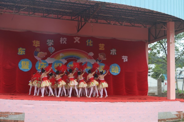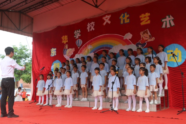 學(xué)校的節(jié)目在老師的精心編排下登臺展示。歌舞朗誦,舞蹈,合唱,時裝秀,相聲,電聲音樂,二胡、古箏、笛子獨奏等多個不同形式的節(jié)目參加了演出,演出時間持續(xù)2個小時。同學(xué)和老師同臺獻技,他們用優(yōu)美的舞姿、動人的歌聲充分展現(xiàn)了東華學(xué)校師生兒童熱愛祖國、昂揚向上的精神風(fēng)貌。舞臺上好戲連連,舞臺下座無虛席,所有的孩子和老師、家長一起沉浸于歡樂的海洋中;合著歡快的音樂,臺上臺下互動,歌聲、掌聲此起彼伏。校園里到處洋溢著節(jié)日歡快氣氛,整個校園成了一片歡騰的海洋。