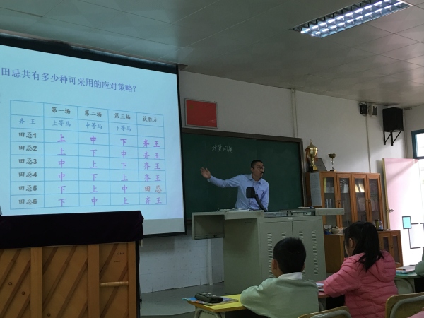 本次活動先由夏傳霞老師執(zhí)教《田忌賽馬》第一課時,借助故事情境完美地解決了4個問題:①理解最佳策略是什么②最佳策略是怎么找出來的,感悟優(yōu)化思想③學習對策問題的意義——絕不僅僅是掌握“對方先出、以弱勝強”這個最佳策略,更應培養(yǎng)尋找最佳策略的優(yōu)化意識。④避免2個思維定勢:對策問題不只是田忌賽馬的以弱勝強,最佳策略也不一定就是唯一的——拍球比賽從三局兩勝到四局三勝,成功打破學生的思維定勢。