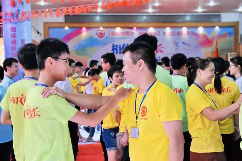 上午活動(dòng)先從尋找同伴、相互介紹認(rèn)識(shí)開始。接著開始游戲環(huán)節(jié),井字游戲、呼啦圈、拼圖游戲和兩人對(duì)話讓孩子們培養(yǎng)積極、主動(dòng)的性格,學(xué)會(huì)嘉許、贊美和賞識(shí)對(duì)方。下午活動(dòng)精彩紛呈,先來團(tuán)隊(duì)展示,團(tuán)隊(duì)在舞臺(tái)上即場(chǎng)編排和表演節(jié)目,展示團(tuán)隊(duì)風(fēng)采。接著是風(fēng)中勁草、漫漫人生路游戲環(huán)節(jié),檢驗(yàn)彼此的信任和團(tuán)隊(duì)協(xié)調(diào)能力。然后的千里畫廊環(huán)節(jié),在家長(zhǎng)們和義工們的陪同下,孩子們畫出自己美麗的未來和人生。緊接著,主持人分別對(duì)老師、義工、學(xué)校領(lǐng)導(dǎo)進(jìn)行嘉許,孩子們不知不覺之間淌下熱淚,還有參加活動(dòng)的每一位將代表愛和勇氣的藍(lán)色絲帶系在自己感激的人的手臂上,和主辦方安排家長(zhǎng)和孩子擁抱環(huán)節(jié),將活動(dòng)推上高潮,感動(dòng)了場(chǎng)上每一個(gè)人?;顒?dòng)的尾聲,先進(jìn)行相伴成長(zhǎng)愛的傳承授旗儀式,讓愛不斷傳承和發(fā)展,再由心海實(shí)踐125共贏隊(duì)將寫有“春風(fēng)得意桃李芬芳”的牌匾贈(zèng)送給學(xué)校,并由紅旗小學(xué)劉麗娣主任代表學(xué)校接受主辦方給學(xué)校自閉癥孩子康復(fù)訓(xùn)練的自籌善款。