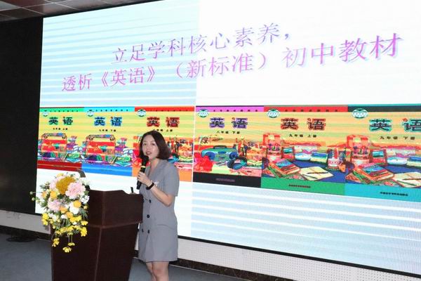 隨后,廖老師為與會老師帶來《立足學科核心素養(yǎng)透析《英語》(新標準)初中教材》主題講座,分享了她對英語綜合能力的理解。隨后從教材結(jié)構(gòu)出發(fā),細致分析了課標與課本在語言技巧、階段特點與側(cè)重、模塊結(jié)構(gòu)等方面的聯(lián)系,期間還結(jié)合問卷調(diào)查、歌曲、優(yōu)秀課例等材料對課標與課本做了生動解讀。最后,廖老師就新知呈現(xiàn)、語言操練與練習、starter以及Unit3的處理等方面分享了幾點教材使用建議,干貨滿滿。