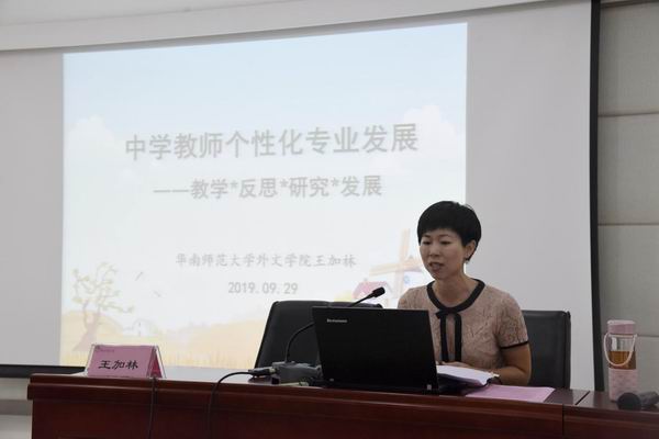 工作室的專業(yè)導(dǎo)師、華南師范大學(xué)外國語言文化學(xué)院的王加林副教授做了主題為“中學(xué)教師個性化專業(yè)發(fā)展――教學(xué)反思 研究 發(fā)展”的專題講座。王教授從2021年即將開始的新高考展開,指出英語教學(xué)應(yīng)以科學(xué)、踏實(shí)的態(tài)度提高學(xué)生英語能力。她還用實(shí)例指導(dǎo)與會者如何選題、教研以及如何開展行動研究。
