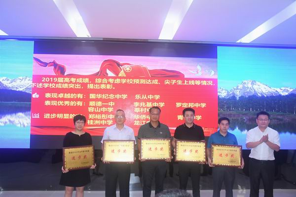 隨后,在熱烈的掌聲中,大會為2019年教學(xué)質(zhì)量突出的12所學(xué)校頒發(fā)獎牌,予以表彰。其中,榮獲卓越獎的有國華紀(jì)念中學(xué)和樂從中學(xué);榮獲優(yōu)秀獎的有順德一中、李兆基中學(xué)、羅定邦中學(xué)、容山中學(xué)、莘村中學(xué);榮獲進(jìn)步獎的有鄭裕彤中學(xué)、華僑中學(xué)、青云中學(xué)、桂洲中學(xué)、龍江中學(xué)。
