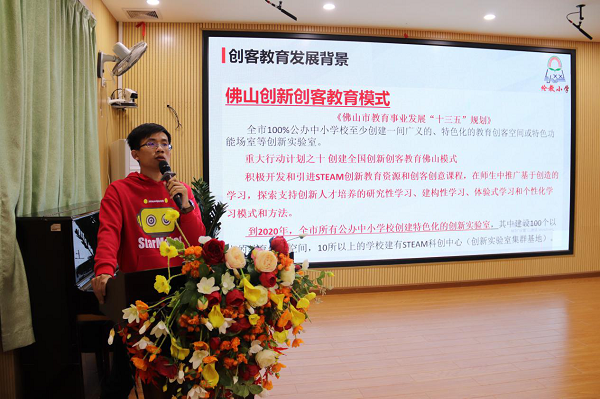 林慶河副校長(zhǎng)介紹倫教小學(xué)創(chuàng)客教育開(kāi)展情況以及星創(chuàng)空間未來(lái)建設(shè)設(shè)想