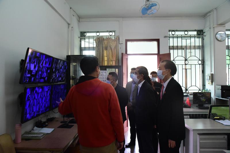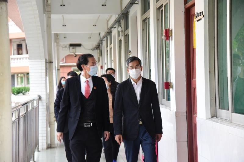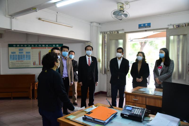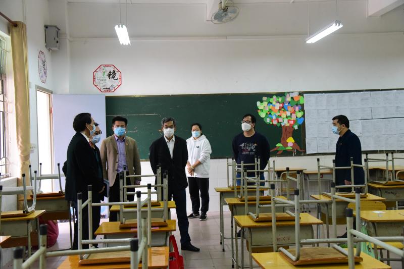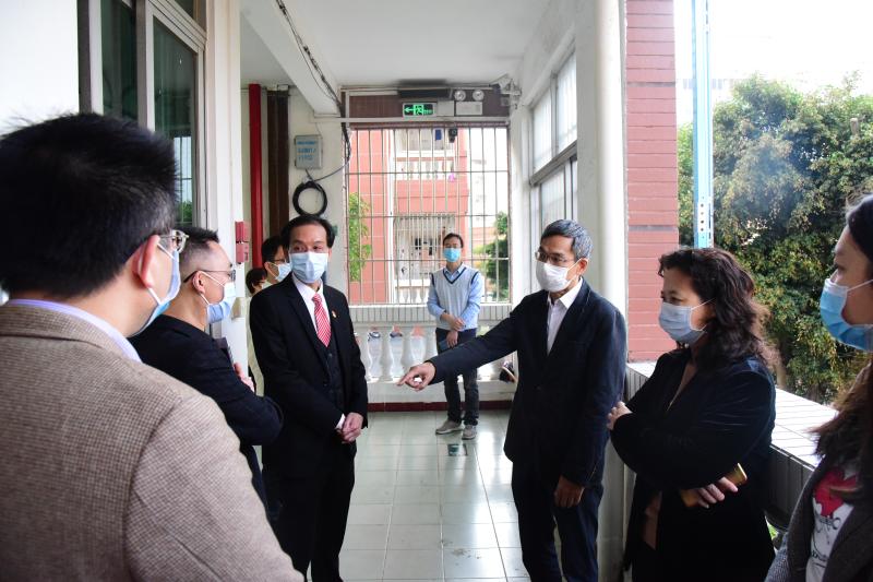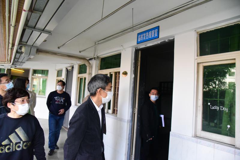 接著,周馭洪副主任一行在吳劍平校長及學(xué)校行政的陪同下,深入到教室、校醫(yī)室、健康觀察室、學(xué)生宿舍和學(xué)生飯?zhí)玫裙δ軋鍪疫M(jìn)行視察。