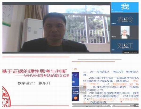 首先大家一起觀摩由工作室主持人張東升老師主講的“基于證據(jù)的理性思考與判斷――WHWM思考法的語文應(yīng)用”專題直播課,本節(jié)課受眾為容山中學(xué)高二年級全體學(xué)生,工作室成員、“思維工具提升群文閱讀能力”課題組成員參與聽課。