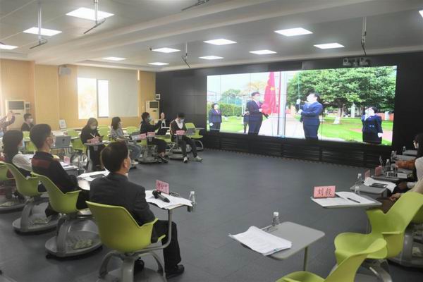 與會人員觀看勒流中學(xué)線上“升旗儀式”