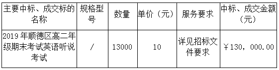 順德區(qū)教育發(fā)展中心于2019年4月8日就2019年順德區(qū)高二年級期末考試英語聽說考試采購項目進行單一來源采購,現(xiàn)就本次采購的成交結(jié)果公告如下:
