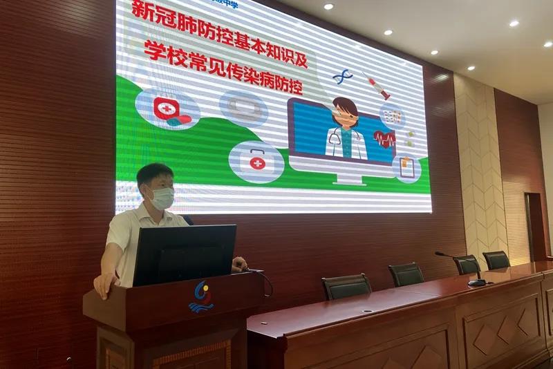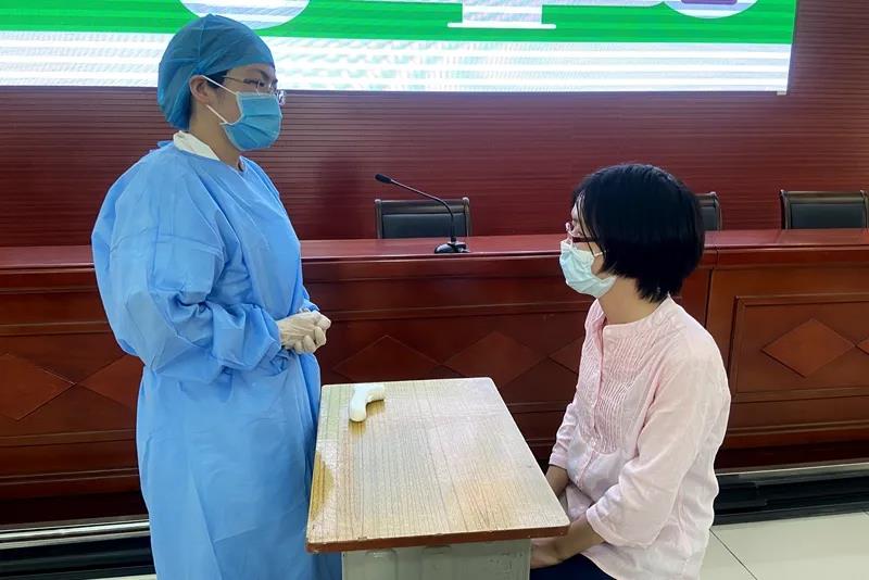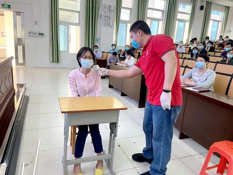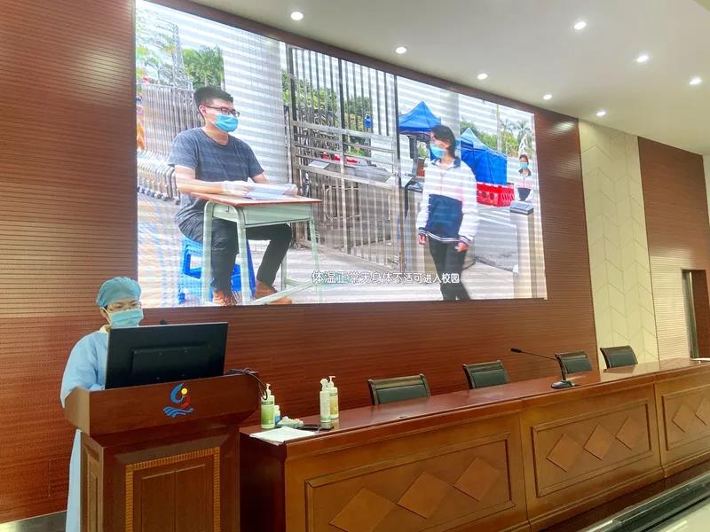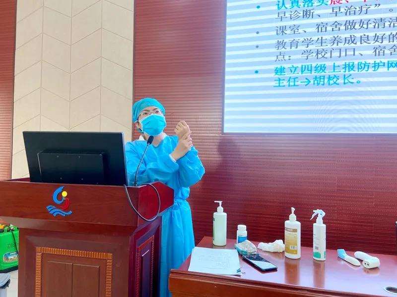 校醫(yī)李杏興就防控知識(shí)進(jìn)行講座,并現(xiàn)場(chǎng)進(jìn)行了返校學(xué)生在教室出現(xiàn)異常狀況的場(chǎng)景演練。演練分別從測(cè)量體溫、校醫(yī)診斷、隔離病人、告知家長(zhǎng)、離校就診等5個(gè)環(huán)節(jié)全程模擬了就診過(guò)程,在場(chǎng)的人員認(rèn)真觀摩了演練全過(guò)程。