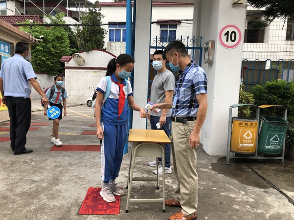 學校為孩子們返校復(fù)學做了各種精心的準備,每一個環(huán)節(jié),每一個細節(jié),都蘊藏著貼心的守護。走進校門,地面上張貼著清晰顯著的標識線,老師們早已守候在校門兩側(cè)維持秩序,并為每一個通過的學生測試體溫、消毒鞋底。孩子們排著整齊的隊伍,保持間隔距離,有序地走進校園。
