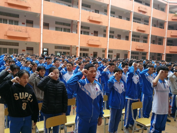 聽完領(lǐng)導(dǎo)和老師的講話,同學(xué)們個(gè)個(gè)精神振奮、倍受鼓舞。在陳曉潼、楊栩兩位同學(xué)的帶領(lǐng)下,大家進(jìn)行了激情澎湃的宣誓,字字鏗鏘,響徹校園。