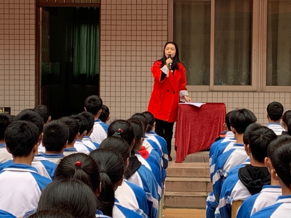 接著教師代表宋芳老師發(fā)表了熱情洋溢的演說(shuō),她深情地回顧了同學(xué)們?cè)谛H暌詠?lái)的學(xué)習(xí)生活,勉勵(lì)全體同學(xué)不負(fù)韶華、不負(fù)師恩、努力拼搏,帶著自信的微笑,贏取中考最后的勝利!