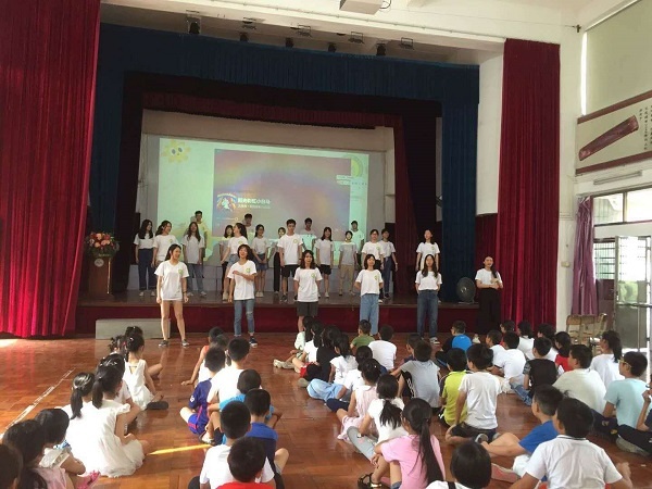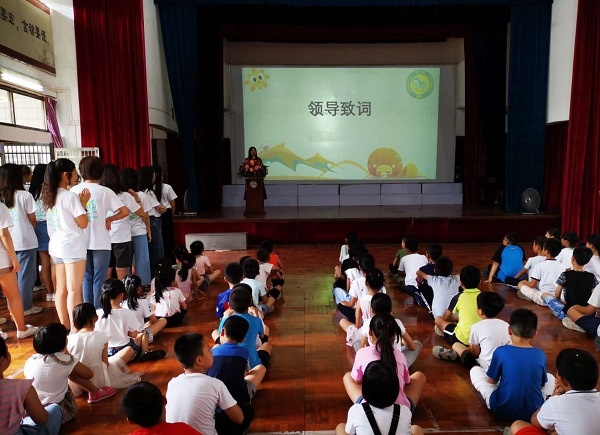 7月8日早上,青馬服務(wù)隊(duì)英語(yǔ)夏令營(yíng)見面會(huì)在中山市申明亭學(xué)校禮堂順利舉行。申明亭學(xué)校鄭育美校長(zhǎng)和寧吉紅、賴強(qiáng)強(qiáng)、劉志雄三位主任和參加夏令營(yíng)的學(xué)生,以及全體青馬服務(wù)隊(duì)的隊(duì)員參加了見面會(huì)。