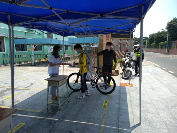 12:00剛過,負責(zé)進行交通疏導(dǎo)的公安民警早早來到校門口,以防接送學(xué)生的車輛在校門口發(fā)生擁堵。12:30分后,同學(xué)們陸續(xù)來到學(xué)校,按照地面張貼的引導(dǎo)標(biāo)線來到進校通道,老師先掃同學(xué)們粵康碼,正常后,再到體溫測檢測處,測體溫正常,進行手部消毒,然后才能進入校園。