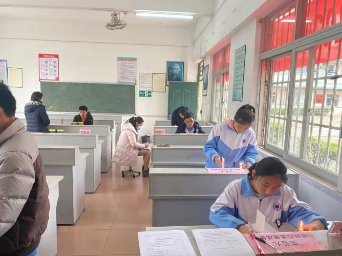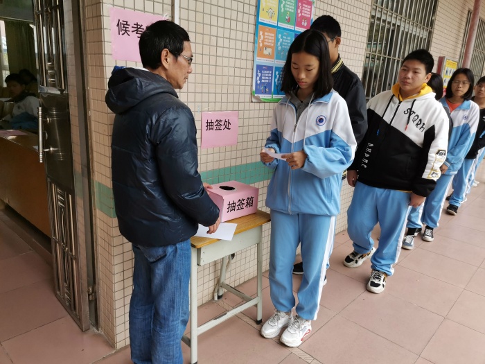 上午8點10分由考務(wù)員到班通知第一場學(xué)生24人到多媒體準(zhǔn)備室抽簽,抽簽后,學(xué)生利用5分鐘時間了解實驗題操作的要求、步驟、注意事項等。8點15分學(xué)生有序地進(jìn)入操作考核室,8點20分整計時員宣布考核開始,神舟學(xué)校六位監(jiān)考教師收卷當(dāng)場評分,評分結(jié)束后,接著進(jìn)第下一場學(xué)生的操作考核。10點左右,神灣鎮(zhèn)教育事務(wù)指導(dǎo)中心吳惠欣老師、神灣中學(xué)物理老師陳木奇來到神舟學(xué)校巡查,監(jiān)控了初三(2)班的第四場考核過程,包括學(xué)生的抽簽,學(xué)生實驗操作和物理教師對學(xué)生操作考核打分情況及整體學(xué)生的操作考核水平都進(jìn)行了監(jiān)督和了解。巡查組對每位監(jiān)考教師每人監(jiān)考兩位同學(xué)操作,考核的學(xué)生沉著操作,對實驗考核工作表示滿意,同時也向?qū)W校提出具體的改進(jìn)建議。