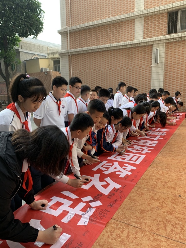 班會(huì)課上,各班班主任針對(duì)“掃黃打非,共建文明校園”這一主題,向同學(xué)們介紹了“掃黃打非”活動(dòng)的積極意義。并通過(guò)圖文、音視頻等形式向同學(xué)們生動(dòng)地介紹了“掃黃”與“打非”的含義。學(xué)生們認(rèn)真地學(xué)習(xí)“掃黃打非”的知識(shí),并在課堂上積極發(fā)表自己對(duì)“掃黃打非”的看法與認(rèn)識(shí)。接著,三年級(jí)、六年級(jí)的學(xué)生代表全校學(xué)生,參與到“掃黃打非,共建文明校園”的簽名活動(dòng)中來(lái)。同學(xué)們?cè)诶蠋煹膸ьI(lǐng)下,以整齊有序的隊(duì)伍一個(gè)接一個(gè)走到簽名欄前,拿起筆慎重地簽上自己的姓名。一筆一劃書寫出了每一位同學(xué)自覺(jué)抵制文化垃圾與非法出版物的決心,更書寫出了他們對(duì)建設(shè)文明校園的信心。