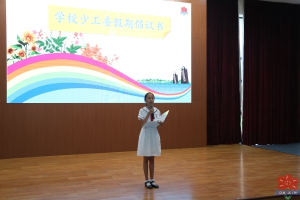典禮的第三部分,由學(xué)校少先隊(duì)大隊(duì)委發(fā)出假期倡議書(shū),倡議同學(xué)們?cè)诩倨谥校e極參加垃圾分類(lèi),小手拉大手,親子共讀及研學(xué)等一系列活動(dòng)。書(shū)是人類(lèi)進(jìn)步的階梯,她倡議同學(xué)們明禮守法、強(qiáng)身健體、品讀經(jīng)典。大隊(duì)部的倡議與法制安全講座相輔相成,同學(xué)們也更加明確了如何度過(guò)一個(gè)充實(shí)而有意義的暑假。