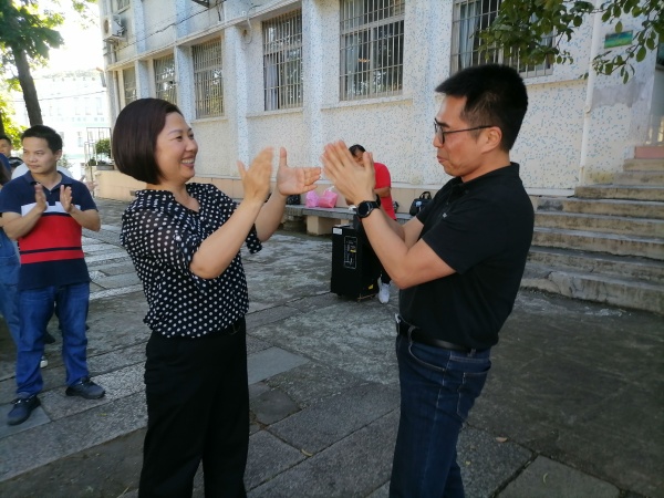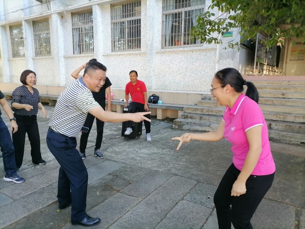 在心理老師的帶領(lǐng)下,活動(dòng)開始。熱身活動(dòng)“桃花朵朵開”營造了輕松歡快的氣氛;“大兵步操”活躍氣氛,同時(shí)讓教師們打破疫情下諸多新規(guī)帶來的不確定感;“為自己鼓掌”讓教師在自我挑戰(zhàn)中樹立信心;“劃拳接力賽”進(jìn)一步激發(fā)了教師們的熱情,釋放了壓力,使活動(dòng)達(dá)到高潮;最后,全體教師圍成一圈進(jìn)行總結(jié)分享,感染彼此的生命活力,增強(qiáng)了團(tuán)隊(duì)凝聚力。