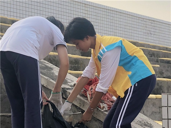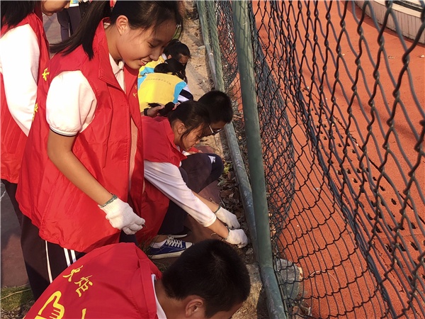 開發(fā)區(qū)一中志愿者服務隊的同學們利用周末的時間,在胡筱鴻副校長的帶領下,與健康花城社區(qū)的工作人員一起進行了衛(wèi)生清理工作。黨員教師黃輝梅則帶著學生志愿者,從開發(fā)區(qū)一中北門出發(fā),撿拾學?;@球場、塑膠跑道、足球場及看臺上的垃圾。教師黨員志愿者們則兵分兩路,分別從正、西門出發(fā),沿著學校圍墻外側人行道,清理沿途墻角和綠化帶里的碎紙、膠袋、包裝盒、舊瓶子等雜物。他們不放過一處死角,清理掉沿途的垃圾。路過的群眾、鍛煉身體的人們、社區(qū)的業(yè)主紛紛為他們的行動點贊。
