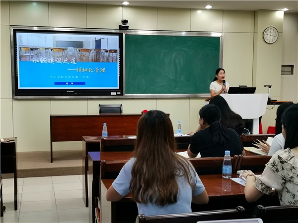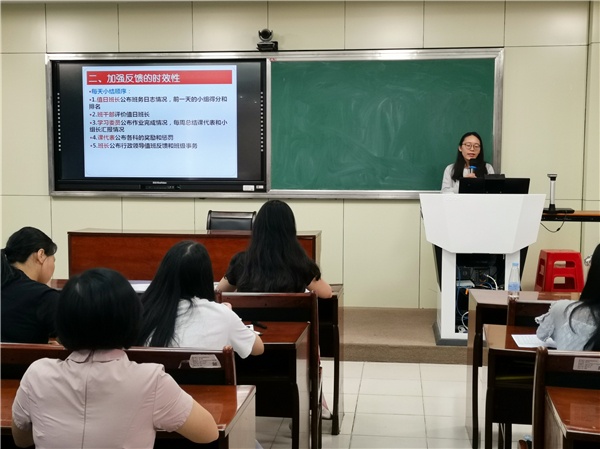 在19位新班主任自我介紹后,培訓會正式開始。首先進行經(jīng)驗分享的是陳萍老師,她以“班級建設(shè)之道——精細化管理”為主題,向與會的老師們展示了自己的高效班級管理方法。陳萍老師以“分解、細化、落實”為管理班級的具體思路,把班級的管理劃分為學習、紀律、衛(wèi)生、常規(guī)四部分,通過班級內(nèi)成立的學習部、紀檢部、統(tǒng)計部、宣傳部、文體部、衛(wèi)生部、人事部進行學生自治。陳萍老師在三年的不懈努力和積極探尋下,不斷培訓學生的自主學習、自主管理、自主評價能力,在初三學年成為了一名輕松、高效的班主任,所帶班級各項成績名列前茅。