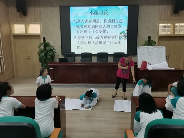 在解釋完什么是青春期這個大問題后,陳老師進行了小組討論,她設(shè)置了兩個問題:1.進入青春期后,你感受到了自己或者觀察到同齡人的身體發(fā)育出現(xiàn)什么變化?2.你感受到自己或者觀察到同齡人的心理活動出現(xiàn)了什么變化?一時間各個小組都沸騰了起來,大家爭相發(fā)言,紛紛就上面兩個問題展開了發(fā)言,有的同學(xué)說感覺自己的個子高了,有的說感到自己的聲音粗狂了等等。
