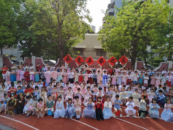 操場上,社區(qū)老師組織孩子們閱讀繪本《中國華服》,了解中國傳統(tǒng)服裝的特點(diǎn)及穿戴的禮儀,并動(dòng)手設(shè)計(jì)自己心目中的中國傳統(tǒng)服裝。 學(xué)生們第一次在學(xué)校里穿上漢服,每個(gè)人的眉宇間閃爍著激動(dòng)與興奮。