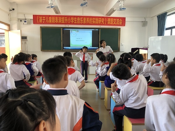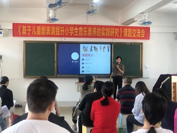 在課題交流分享中,課題主持人鄧娟主任首先從課題的選題背景、概念的界定、研究目標(biāo)、研究內(nèi)容等方面向與會老師們進行了介紹;接著對課題研究兩年以來的情況也進行了詳細的闡述:1、開展問卷調(diào)查、撰寫調(diào)查報告;2、開設(shè)兒童劇表演社團,建立多元化方式;3、打造音樂素養(yǎng)精品課程,提高音樂教學(xué)質(zhì)量;4、開發(fā)區(qū)級小課題;5、研討交流,共同成長;6、研讀專著教材、整理校本課程資源;7、舉行系列校園兒童劇表演活動;8、課題組成員在研究過程中所獲得的系列成果展示等。最后,鄧娟主任對課題進行下一階段的努力方向進行了展望。最讓老師們覺得受益匪淺的是,她還講解到兒童劇表演如何走向音樂常規(guī)課堂:課前入戲——語言引導(dǎo)——劇情安排——情景教學(xué)。這幾個教學(xué)環(huán)節(jié)使大家耳目一新,起到了傳經(jīng)、授教、解惑的作用。