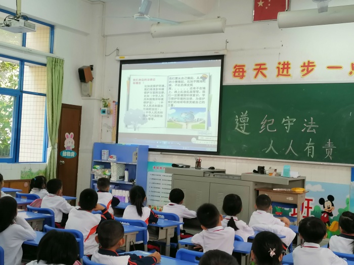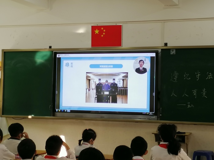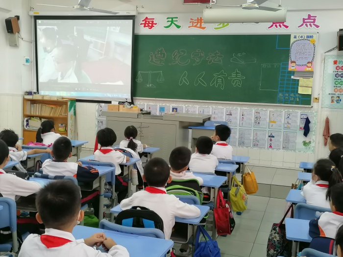 班會(huì)課中,梁小玲副校長以《民法典》為上課的主要內(nèi)容,帶著學(xué)生認(rèn)識(shí)了幾個(gè)重要的法律知識(shí),如:我們中國的法律從什么時(shí)候開始的?為什么有法律的產(chǎn)生?國家法制宣傳日的時(shí)間是哪一天?我們?cè)趯W(xué)校學(xué)習(xí)是如何受法律保護(hù)的?我們身邊的法律有哪些?等等。梁小玲副校長用生動(dòng)的故事和學(xué)生身邊的真實(shí)事例進(jìn)行深入淺出地講解,令枯燥乏味的內(nèi)容變得簡單易懂、生動(dòng)有趣。接著用視頻的形式,截取了中山市人民檢察院洪敏樺檢察官關(guān)于《依法抗“疫”人人有責(zé)》的講座,讓學(xué)生們認(rèn)識(shí)到不執(zhí)行疫情防控措施的法律后果。洪法官用了兩起疫情中發(fā)生的違法事件,具體講述了這一條法律的重要性和必須性,以及帶來的嚴(yán)重后果,讓大家認(rèn)識(shí)到落實(shí)好《中華人民共和國防疫法》是非常必要的。在本次法制教育中,除了有班會(huì)課的學(xué)習(xí),校園內(nèi)還懸掛了橫幅,張貼了法律宣傳海報(bào),從多途徑引導(dǎo)學(xué)生學(xué)法守法,做新時(shí)代好少年。