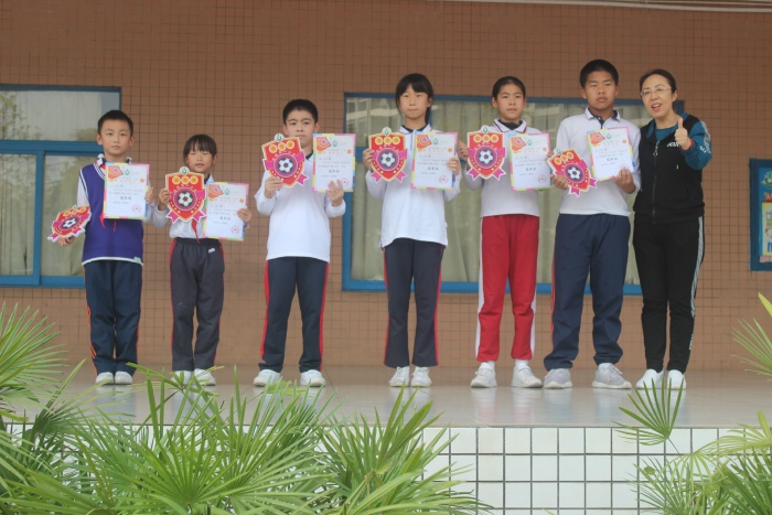 首先出場(chǎng)的是五(5)班同學(xué)的啦啦操表演,熱情洋溢、青春活力的表演贏得觀眾陣陣掌聲。之后,踢進(jìn)10球的六(5)班何昀珊同學(xué)作為最佳射手代表講話。在本屆足球賽中共有9名同學(xué)獲得了最佳射手獎(jiǎng)。接著進(jìn)行頒獎(jiǎng)儀式。校長(zhǎng)們?yōu)樾@足球賽中獲獎(jiǎng)班級(jí)頒發(fā)獎(jiǎng)牌,為最佳射手們頒發(fā)獎(jiǎng)狀,為跳繩比賽和50米跑比賽中各年級(jí)前十名的選手頒發(fā)獎(jiǎng)狀,同時(shí)為參加市區(qū)各項(xiàng)體育競(jìng)賽獲獎(jiǎng)的選手頒發(fā)獎(jiǎng)狀。歷時(shí)近2個(gè)月的體育節(jié)活動(dòng),同學(xué)們積極參與、奮勇拼搏,收獲了各自的成果,頒獎(jiǎng)是對(duì)他們努力的肯定。緊接著,鄂校長(zhǎng)對(duì)本次體育節(jié)活動(dòng)進(jìn)行總結(jié),并宣布體育節(jié)暨第六屆“校長(zhǎng)杯”校園足球賽(第一輪)閉幕,五彩繽紛的禮花在舞臺(tái)上空飛舞,給體育節(jié)閉幕式帶來(lái)歡慶和喜悅。