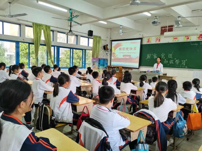 活動中,各班老師首先向同學(xué)們介紹了“國家憲法日”的來歷和意義,然后通過一系列具體的數(shù)據(jù),表明了青少年違法犯法形勢的嚴(yán)峻。接著,老師還向大家介紹了一些具體的案例,在案例里同學(xué)們更清楚地認(rèn)識到青少年走上犯罪的途徑和原因。在具體的案例里,大家還認(rèn)識到青少年犯罪的量刑,知道了青少年犯罪所負(fù)刑事責(zé)任的類型,對憲法關(guān)于青少年犯罪有了更具體的了解。最后,老師鼓勵同學(xué)們要識法守法護法,只有“健康現(xiàn)在才能幸福未來”。全校師生進行了憲法日的宣誓儀式,同學(xué)們承諾學(xué)習(xí)憲法知識,維護憲法權(quán)威,為建設(shè)富強、民主、文明、和諧的社會主義國家努力奮斗。