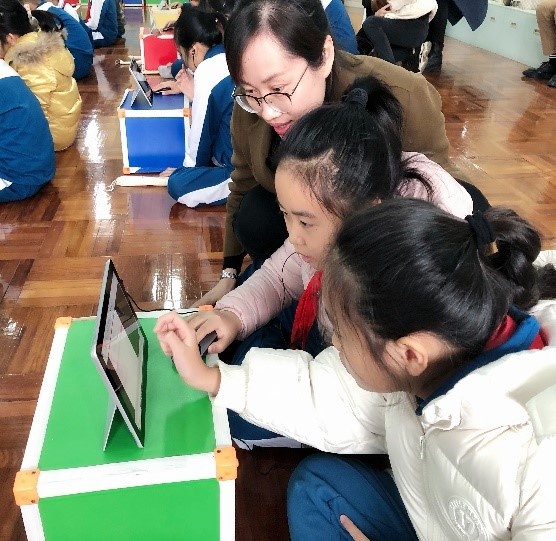 首先由石岐中心小學(xué)大信學(xué)校謝華老師帶來四年級豎笛旋律創(chuàng)編課《吹好sol la si》。謝老師重點教授豎笛sol la si的吹奏指法。她通過三條節(jié)奏練習(xí)讓學(xué)生熟悉sol la si三個音的指法,隨后用“師問生答”的方式引導(dǎo)學(xué)生進(jìn)行旋律創(chuàng)編,鞏固了學(xué)生對sol la si三個音的指法掌握,最后學(xué)生兩人一組在平板設(shè)備上通過西貝柳斯軟件用sol la si三音進(jìn)行旋律創(chuàng)編并展示。謝老師教學(xué)設(shè)計新穎獨特,在傳統(tǒng)課堂的基礎(chǔ)上加入了數(shù)字化信息設(shè)備,各個環(huán)節(jié)環(huán)環(huán)相扣,層層深入,為大家?guī)砹艘还?jié)豎笛與創(chuàng)編相結(jié)合的優(yōu)質(zhì)課。謝老師這一節(jié)音樂課又“新”又“潮”,華師附小的老師直言讓人大開眼界,令人稱奇。