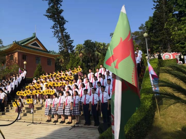 當(dāng)天晴空萬里,空氣清新。石岐第一小學(xué)的陽光天使合唱團(tuán)40名小演員們?cè)诙跗G霞校長的帶領(lǐng)下,穿著整齊的校服,戴著鮮艷的紅領(lǐng)巾,早早就來到了紀(jì)念中學(xué)的校園里等候活動(dòng)的開始。上午九點(diǎn),在紀(jì)念中學(xué)的民國建筑群漢白玉雕像前,一臺(tái)精彩的文藝表演拉開了校慶活動(dòng)的序幕。石岐第一小學(xué)的陽光天使合唱團(tuán)和紀(jì)中合唱團(tuán)的大哥哥、大姐姐一起唱起了由著名作曲家李海鷹寫的《我們的孫中山》,美妙的歌聲在紀(jì)念中學(xué)的上空飄響:五桂山下,蘭溪河畔,原野飄香宛如天堂,翠亨村曉醒來的阡陌上,走過來一個(gè)人——我們的孫中山。走過多少路,名字叫中山,條條中山路都通往四方,飛越大海聯(lián)結(jié)中國心,世界的孫中山,我們的孫中山。