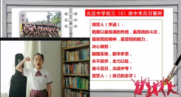 在家長代表發(fā)言后,各班領誓員帶領全班同學起誓。屏幕前的學生昂首挺胸,緊握右拳,高呼誓詞,家長們紛紛用手機留下珍貴的影像。各班的領誓人神情莊嚴凝重,聲音嘹亮激越,喊出了自己班級的誓詞,通過網(wǎng)絡感染著終端的每名同學和家長。初三級還發(fā)動了“掃二維碼,我要宣誓”活動。每位學生都鎖定自己的目標高中和說出自己的宣誓詞。最后,我校退休反聘的孫德菊老師連麥給學生寄語,她勉勵同學們珍惜當下,好好學習,同時表達了對北區(qū)中學深厚的感情。