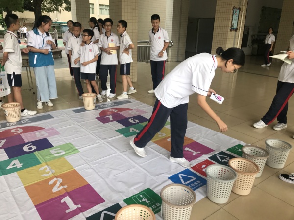 “實踐是檢驗真理的唯一標準”,為了讓學生真正的參與到實踐中來,學生們在空架層進行了“垃圾分類進課堂”游園活動,活動現(xiàn)場設置了如“垃圾分類投放模擬游戲”、“投籃”、“拼圖”、“跳飛機”和“抓沙包”等系列垃圾分類主題游戲攤位,供學生們體驗游玩。學生積極參與,并樂在其中,通過游戲的方式,加深學生對垃圾分類的認識。