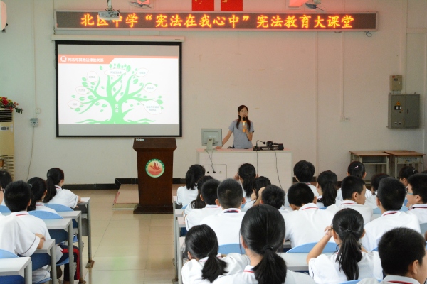 “憲法教育大課堂”是由省普法辦、省司法廳、省教育廳、團省委、省律協(xié),根據(jù)中央和省關(guān)于開展憲法宣傳教育和貫徹實施的重要部署,圍繞“尊崇憲法、學(xué)習(xí)憲法、遵守憲法、維護憲法、運用憲法”,組織開展面向青少年學(xué)生的憲法學(xué)習(xí)宣傳教育活動。北區(qū)中學(xué)舉行“憲法在我心中”教育大講堂活動,讓學(xué)生學(xué)法、知法、懂法、守法,努力成為一名遵紀守法的好公民。