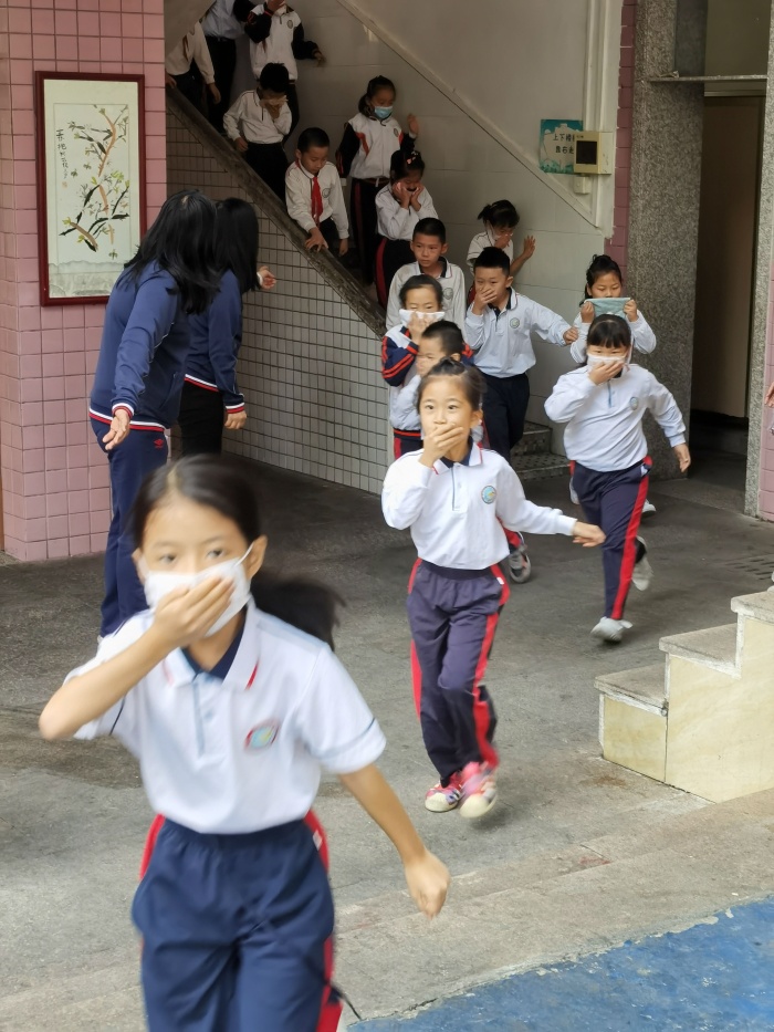 接著進(jìn)行體驗(yàn)生命通道安全疏散演練,通過上周五的提前演練,今天的演練井然有序。隨著廣播提示,火災(zāi)消防演練正式開始,各樓層值日老師、樓梯轉(zhuǎn)角負(fù)責(zé)人迅速到位,班主任第一時(shí)間到班,有序組織學(xué)生安全撤離。撤離過程中,學(xué)生們紛紛彎著腰,用手或者紙巾捂著口鼻,遇到“煙霧彈”時(shí)沉著冷靜,沿著指定逃生路線,安全快速地到達(dá)操場(chǎng)安全區(qū)域。到達(dá)后,學(xué)生蹲在操場(chǎng)上,繼續(xù)用手或者紙巾捂住嘴鼻,認(rèn)真對(duì)待本次火災(zāi)消防演練。同時(shí)班主任馬上清點(diǎn)班級(jí)人數(shù),每個(gè)班級(jí)的班長及時(shí)上報(bào)人數(shù)。