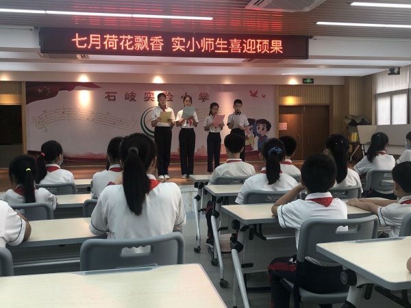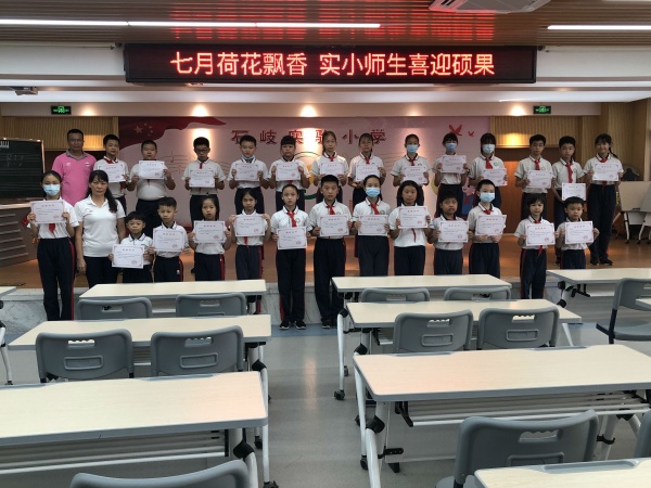 由于疫情的關(guān)系,活動在紅領(lǐng)巾電視臺舉行,由五年級的肖妙可、劉浩天、孫曼喬、梁藝四位同學(xué)主持?!盀榈氖遣蓴X晶瑩的碩果,為的是見證我們的成長!”升旗儀式后,活動在主持人響亮的問候聲中拉開了序幕。小主持說:近期,在老師同學(xué)的努力下,又有一批師生獲獎,其中,在第二屆廣東中小學(xué)生書信大賽中,六4班的曾銀倩、王藝臻榮獲三等獎,孫月瓊老師被評為優(yōu)秀指導(dǎo)老師獎。在2019年中山市小學(xué)生朗誦比賽活動中,六1班的楊俊蕾、六5班的楊俊朗以及許可、閆家睿四人朗誦的《永遠(yuǎn)的第十一位教師》榮獲一等獎,高琳老師被評為優(yōu)秀指導(dǎo)教師。楊俊蕾榮獲2019—2020年度中山市優(yōu)秀少先隊(duì)員稱號,五4中隊(duì)榮獲2019—2020年度中山市少先隊(duì)紅旗中隊(duì)稱號。伍金連老師榮獲2019——2020年度中山市優(yōu)秀少先隊(duì)輔導(dǎo)員稱號。在中山市2019年中華優(yōu)秀傳統(tǒng)文化教育論文評選活動中,禤志娟老師撰寫的論文《精衛(wèi)填海教學(xué)設(shè)計(jì)及教學(xué)策略》、肖潔老師撰寫的論文《試論小學(xué)英語教學(xué)中傳統(tǒng)民間游戲的運(yùn)用》、黃月桃老師撰寫的論文《傳統(tǒng)節(jié)日文化的教育提升學(xué)生的核心素養(yǎng)》均榮獲三等獎等等。在2020年石岐區(qū)第五屆尋找“最美南粵少年”和“新時代好少年”活動評比中,六1班的楊俊蕾榮獲活力好少年和才藝好少年,六2班的梁婧萱榮獲才藝好少年、張浚生榮獲勤學(xué)好少年、五2班的職卉然榮獲活力好少年。