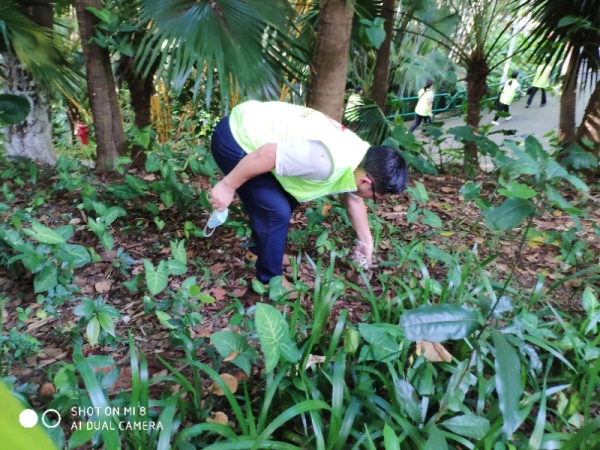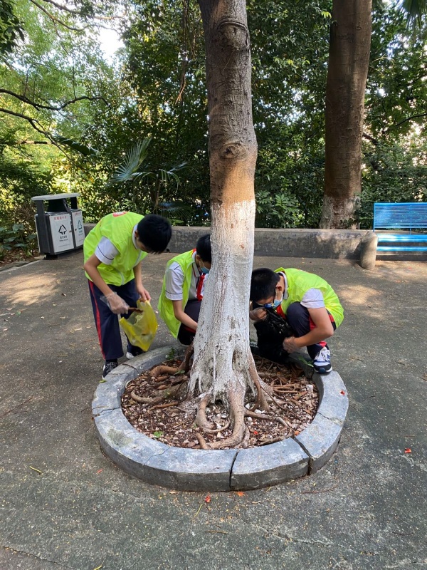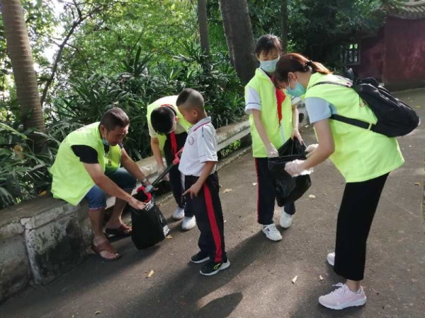 6月12日下午,六年級(jí)各班15名親子義工家庭以及各班主任、學(xué)校行政共150多名志愿者手持清理 “神器” 來到煙墩山開展清潔工作。有的帶著藍(lán)色手套,有的拿著白色的塑料袋,還有的手拿鉗子,戴手套的同學(xué)撿垃圾,拿塑料袋的家長收垃圾,就這樣,大家配合的十分默契。不管年紀(jì)大小,父母和小義工們都很認(rèn)真,醒目養(yǎng)眼的義工服成了煙墩山里一道亮麗的風(fēng)景線。大路上垃圾不多,于是大家鉆到花圃里發(fā)現(xiàn)了大量的垃圾。有游客丟棄的煙頭、紙巾、果皮、瓜子、食品袋等各種生活垃圾,家長們都說沒想到有這么多垃圾,袋子都快裝不下了。一個(gè)多小時(shí)后,草坪上、過道上的垃圾就被檢光了。大家陸陸續(xù)續(xù)回到集合點(diǎn),垃圾都裝滿了袋子,大人和孩子們都走得滿頭大汗,雖然累,心里卻是開心的,用行動(dòng)傳播環(huán)保理念,為煙墩山公園增添了亮麗的色彩,為煙墩山公園的美好環(huán)境貢獻(xiàn)了一份力量。學(xué)校老師則以年級(jí)組為單位,利用中午的時(shí)間每周完成一次的義工服務(wù)活動(dòng),在校內(nèi)、外展開清潔、消毒等工作。近日,中山天氣是龍舟水加烈日高照,勞動(dòng)中老師們都濕透了衣服,大家甚至顧不上喝一口水,一絲不茍地對(duì)周圍環(huán)境的角角落落都進(jìn)行了全方位的清理,他們忙碌拾撿的身影也吸引了一些路過的市民主動(dòng)參與到撿拾行動(dòng)中。