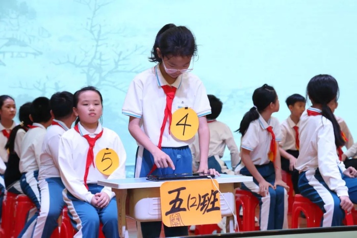 人間自是有絕句,紅塵有幸能讀詩(shī)。五年級(jí)詩(shī)詞大會(huì)為讀書節(jié)擦亮了詩(shī)韻風(fēng)骨。詩(shī)詞大會(huì)帶領(lǐng)孩子們看“人面桃花相映紅”,聽“稻花香里說豐年”,嘆“霜葉紅于二月花”。