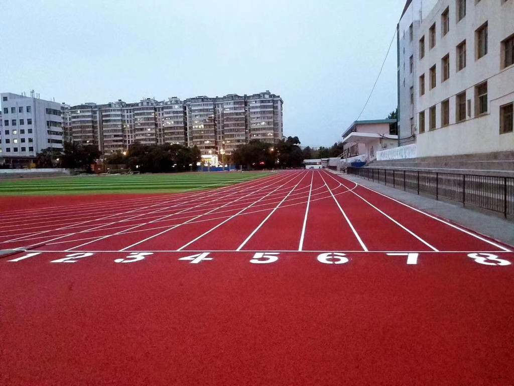 (1)首先檢查基礎(chǔ)層的平整度,對凹凸部位進行找平(如水泥砼基礎(chǔ)需酸洗)。?(2)底膠鋪設(shè): ?鋪設(shè)底膠之前先將地基基礎(chǔ)清掃干凈,準(zhǔn)備好施工用的工具。?a) 按照工藝要求測量出施工線的位置,放好施工線。?b) 鋪設(shè)時由場地一側(cè)開始,按場地寬度一次性刮膠。?c) 刮膠時速度均勻,及時對露底、凹陷、凸起處進行補膠或刮平。?d) 成膠后,對全場進行檢查,以保證面膠鋪設(shè)的厚度。?(3)面膠的攤鋪: ?a)刮膠時盡量縮短每一桶膠液的間隔時間,使成膠速度均勻一致。 ?b)時刻觀察膠面的厚度。 ?c)刮面膠,在面膠未固化前,撒上紅顆粒,待其完全固化后,將多余面膠粒清掃干凈。 ?d)噴膠,確保顆粒不脫落。?(4)工藝線噴劃: ?按照現(xiàn)行的田徑場地設(shè)施標(biāo)準(zhǔn)準(zhǔn)確測量出工藝線的位置,然后用聚氨酯漆噴刷